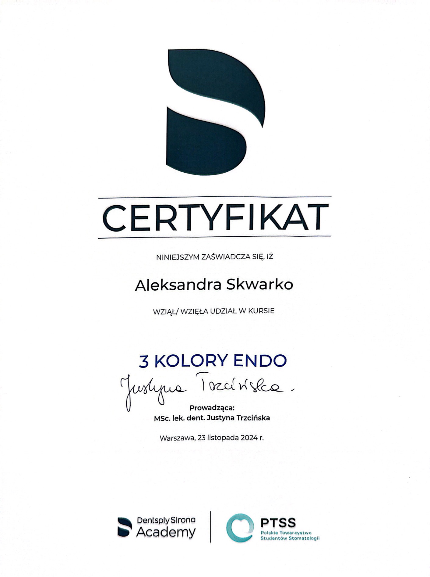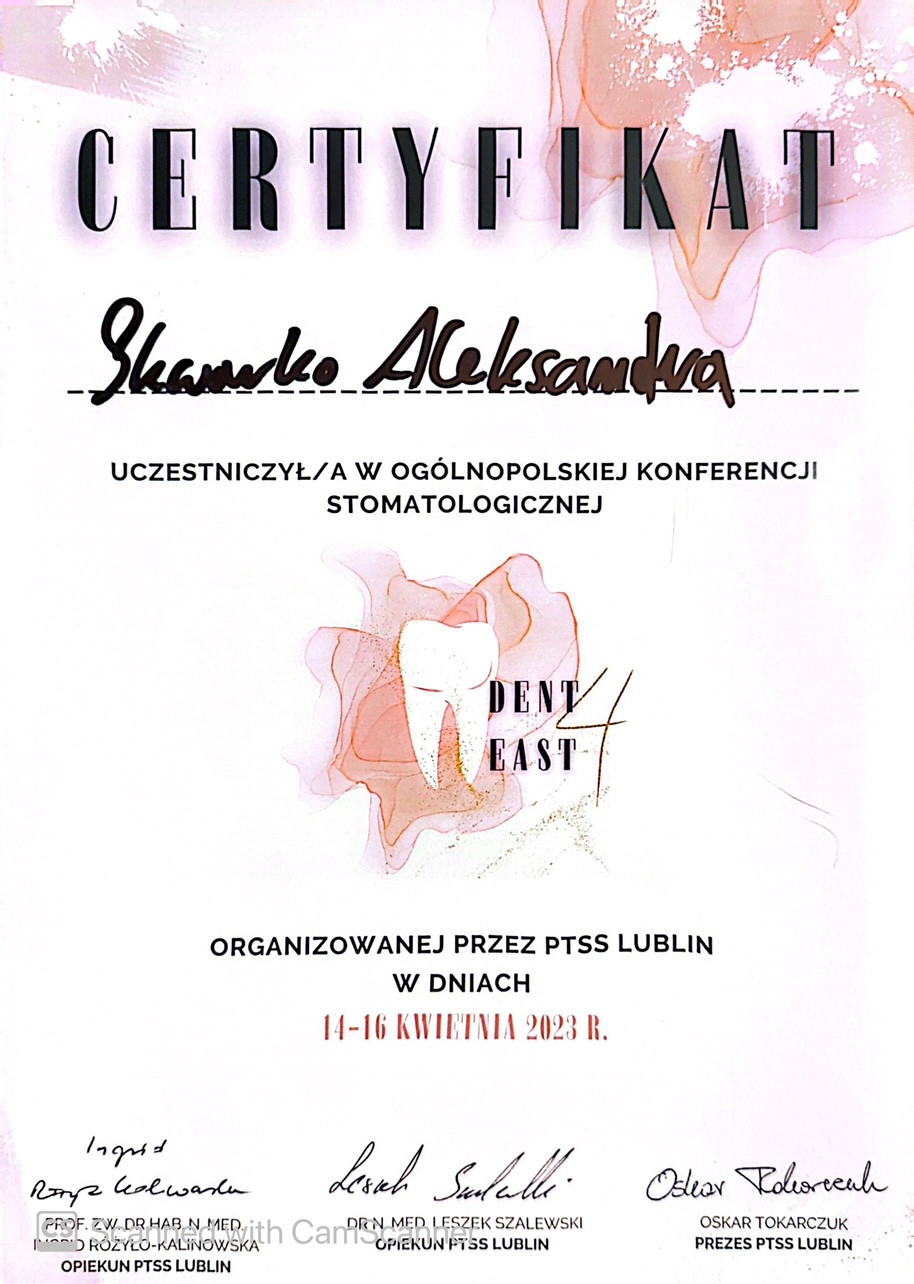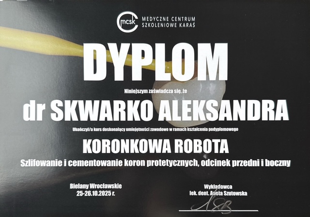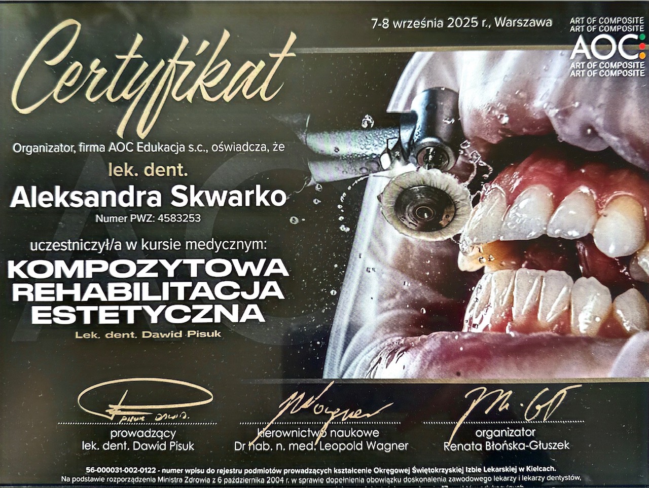 Stale podnosi swoje kwalifikacje, uczestnicząc w kursach i szkoleniach z zakresu nowoczesnej stomatologii, aby zapewnić pacjentom leczenie na najwyższym poziomie.