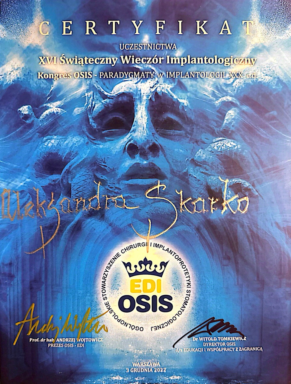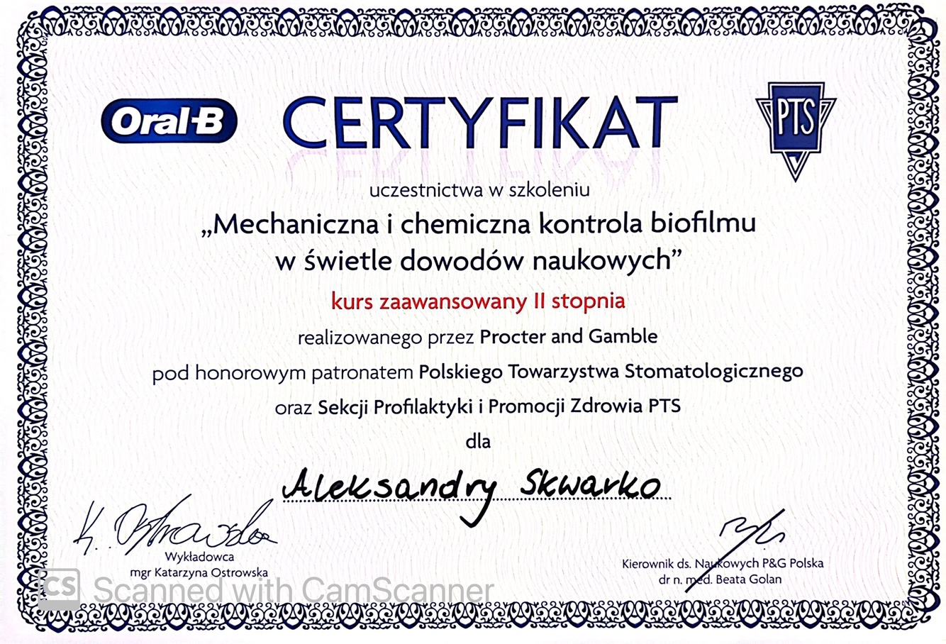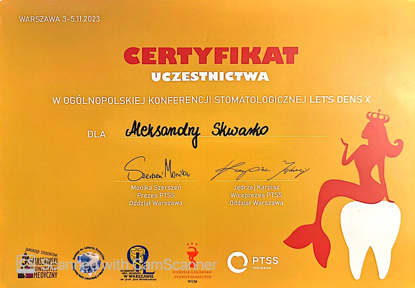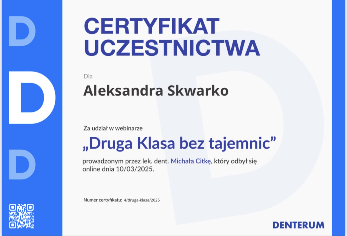 Stale podnosi swoje kwalifikacje, uczestnicząc w kursach i szkoleniach z zakresu nowoczesnej stomatologii, aby zapewnić pacjentom leczenie na najwyższym poziomie.