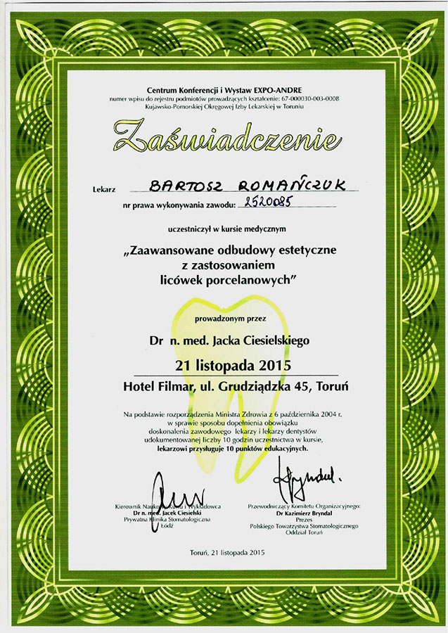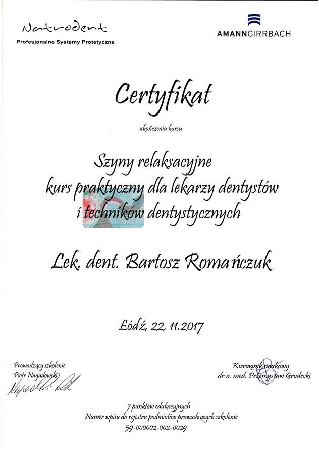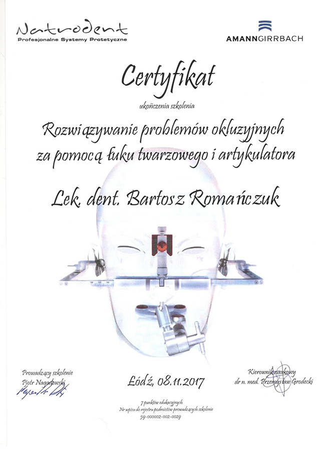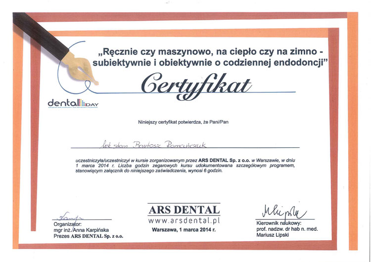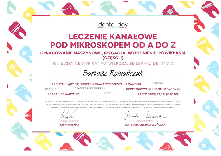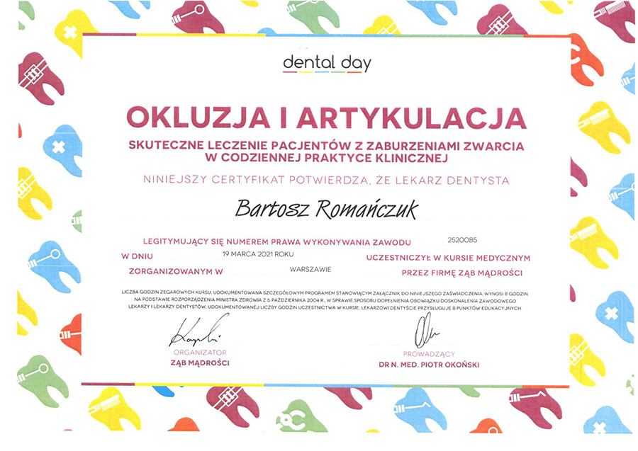 W swojej codziennej praktyce dr Romańczuk dba zarówno o precyzję i profesjonalizm swojej pracy, jak i o to, aby jego pacjenci czuli się bezpiecznie i komfortowo podczas wizyt w naszym gabinecie. Efektem jest zdrowy uśmiech pacjentów i satysfakcja z wykonywanej pracy.