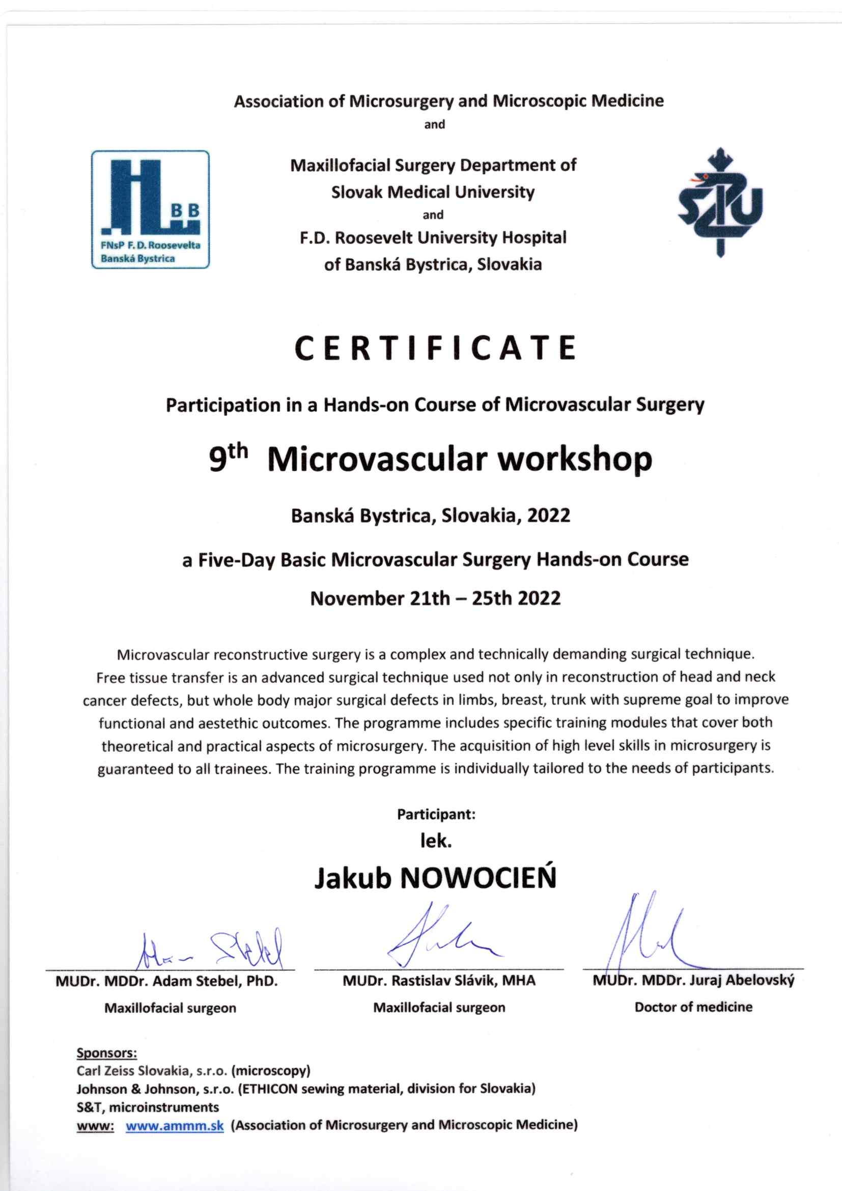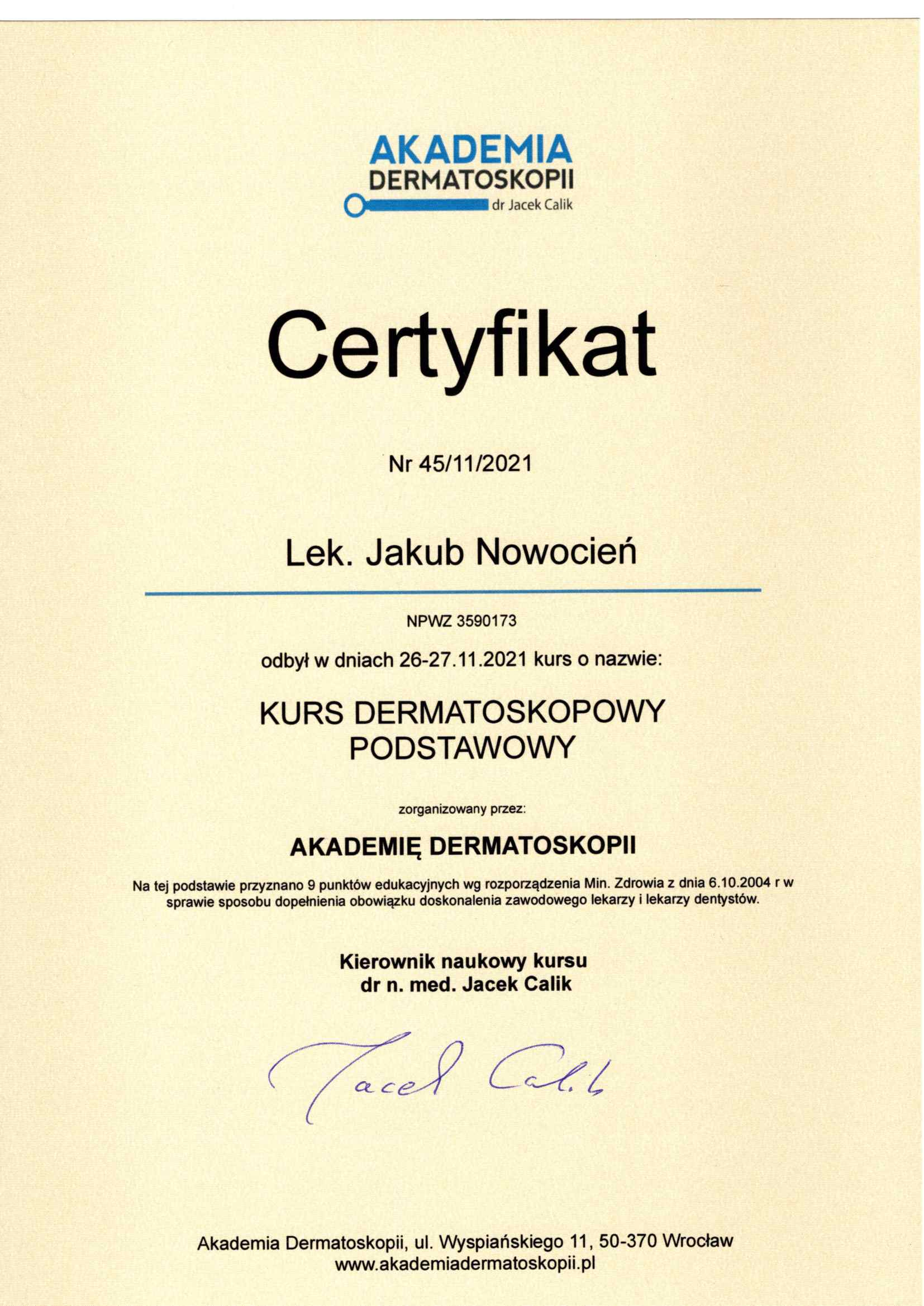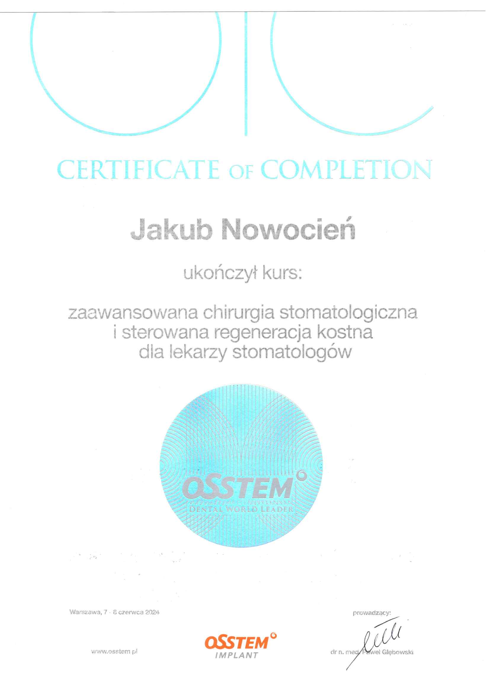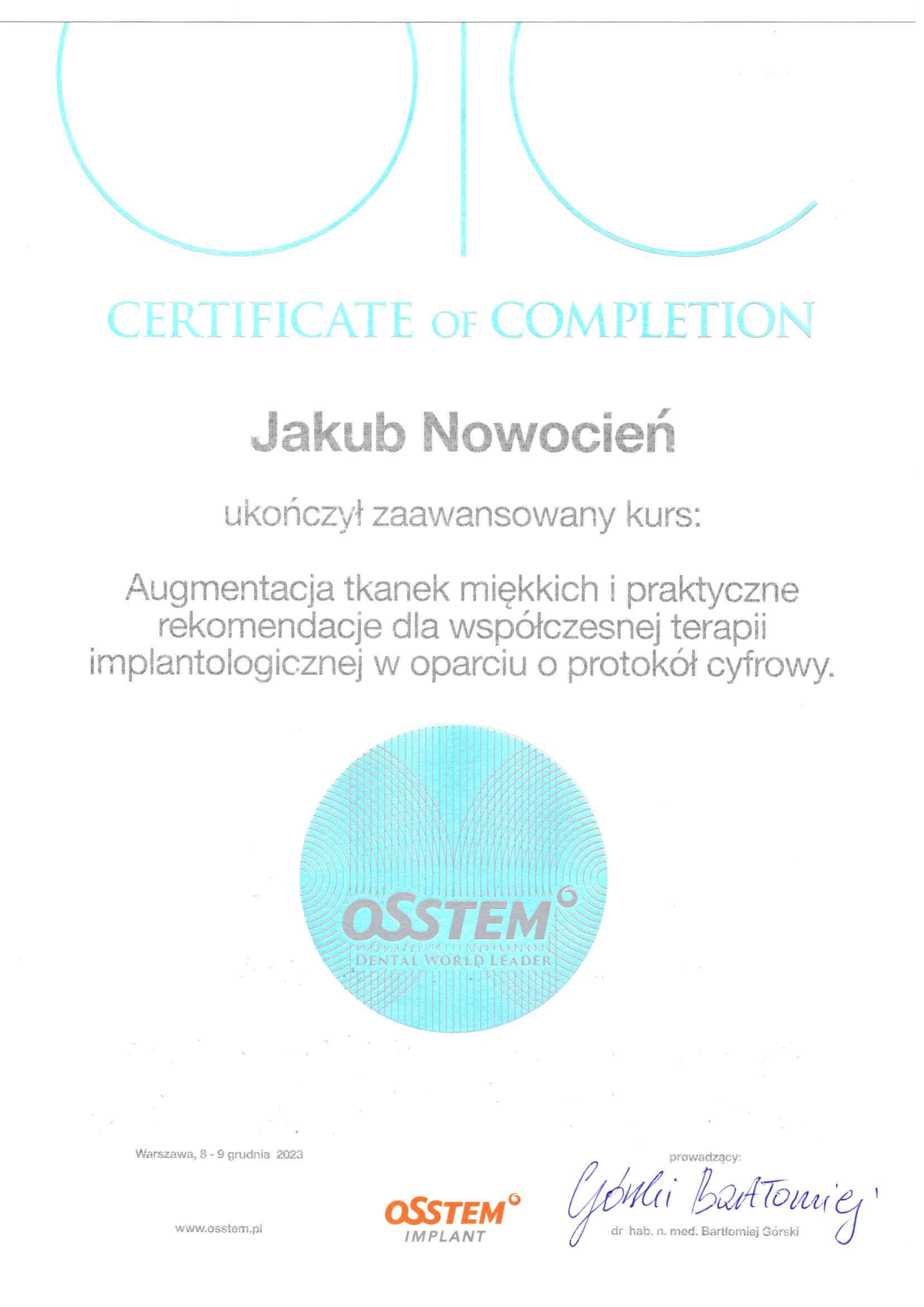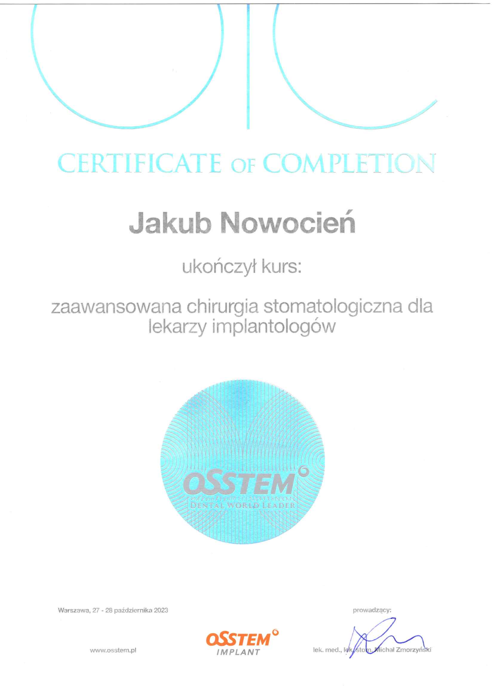 Absolwent Uniwersytetu Medycznego w Warszawie na Wydziale Lekarskim. Tytuł specjalisty chirurgii szczękowo-twarzowej otrzymał po odbyciu staży specjalizacyjnych w Klinice Chirurgii Szczękowo-Twarzowej w szpitalu przy ulicy Szaserów w Warszawie. W naszej klinice pan doktor wykonuje trudne zabiegi chirurgiczne, implantację – też nawigowaną przy użyciu szablonów projektowanych 3D – oraz powiązane z implantacją zabiegi chirurgiczne.