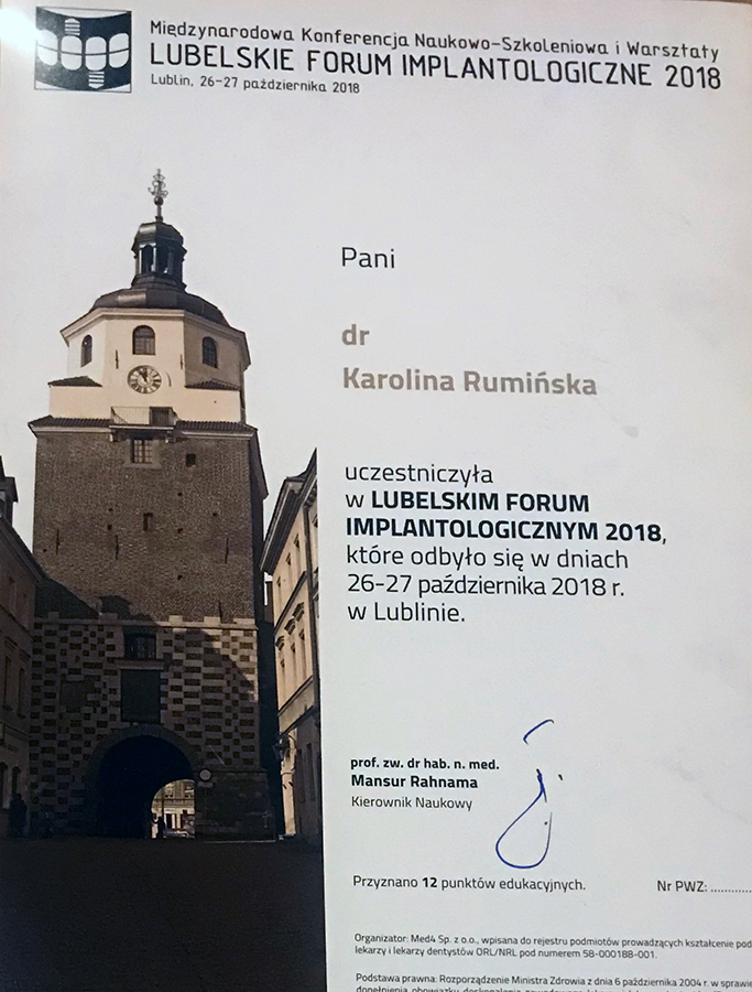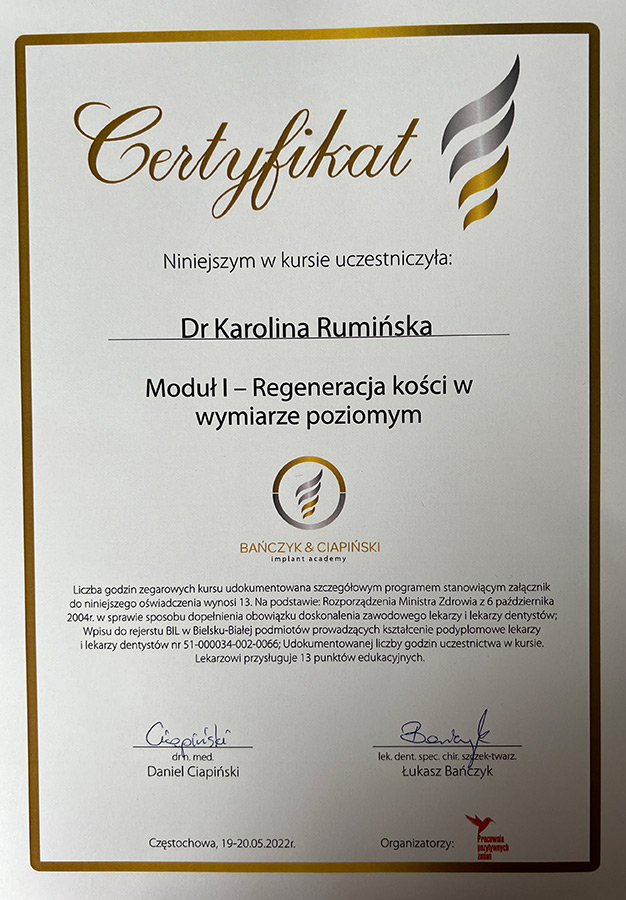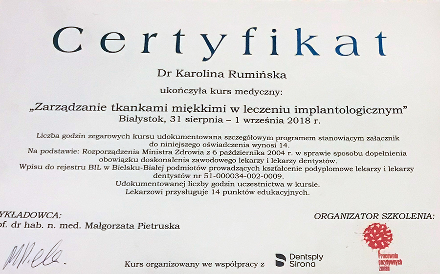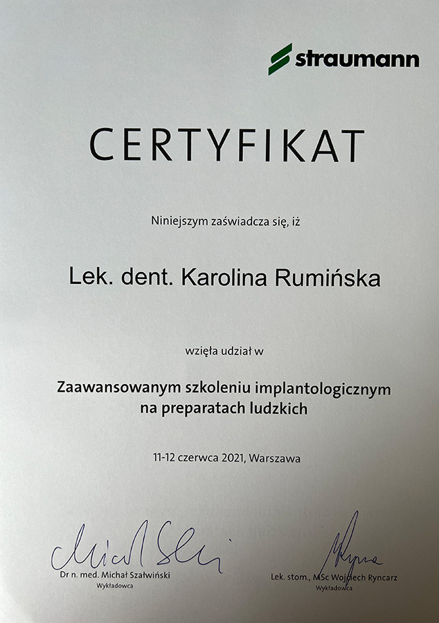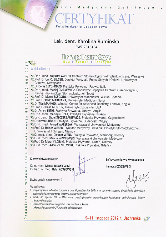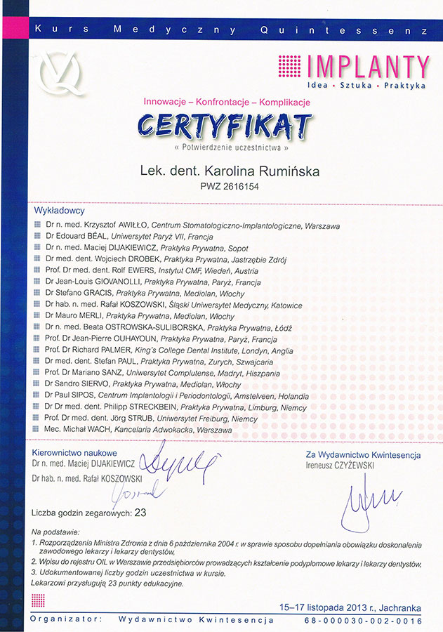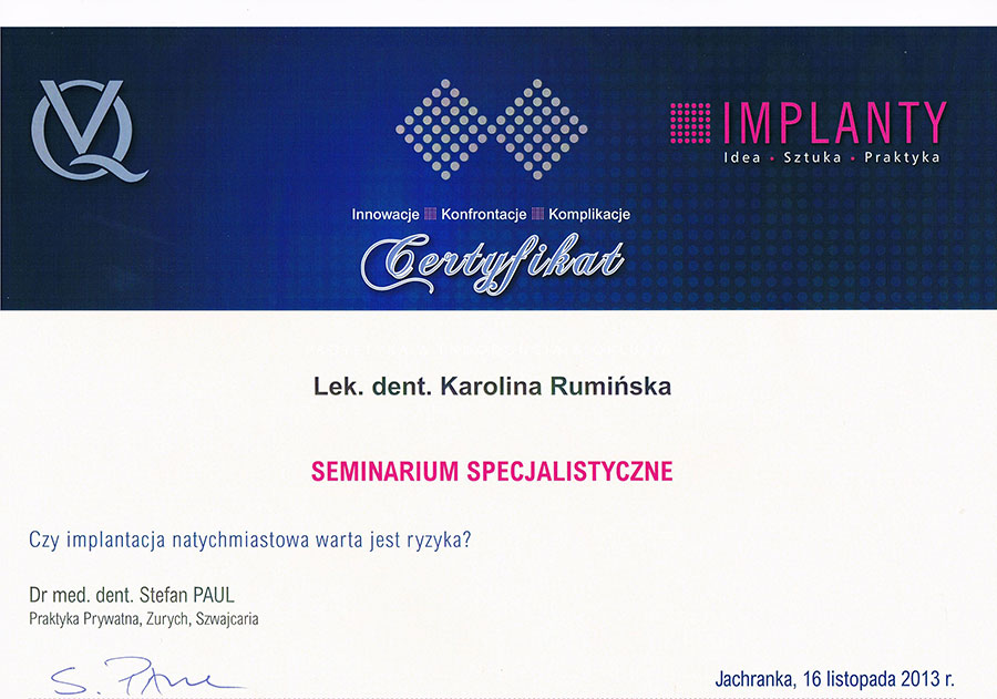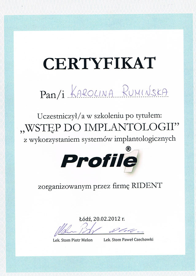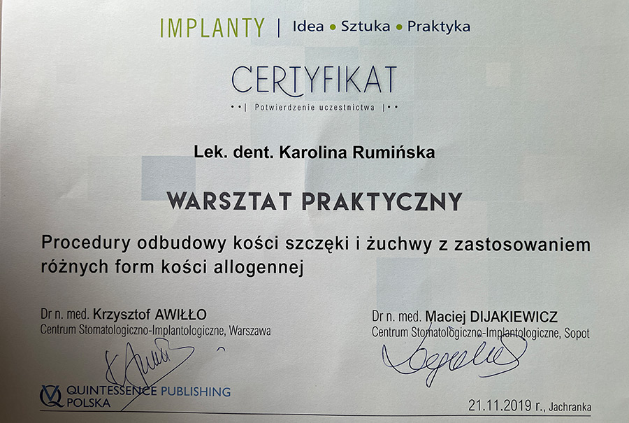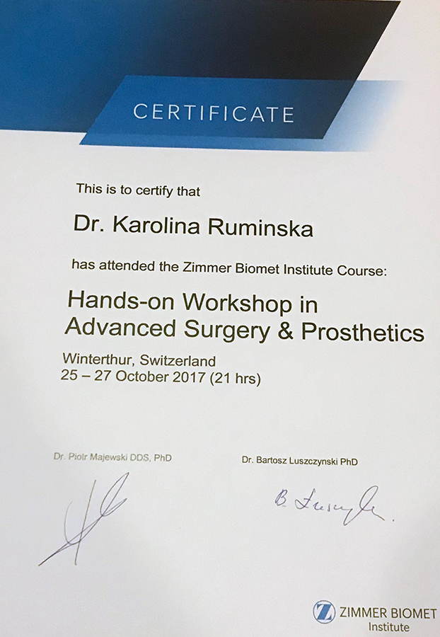 Od początku swojej kariery zawodowej pasjonuję się chirurgią i implantologią, stale podnosi swoje kwalifikacje na krajowych i zagranicznych szkoleniach. Delikatna, precyzyjna i zawsze dba o najwyższy komfort podczas zabiegu. Największą satysfakcją dla pani doktor jest uśmiech i zadowolenie pacjenta po najtrudniejszych zabiegach.