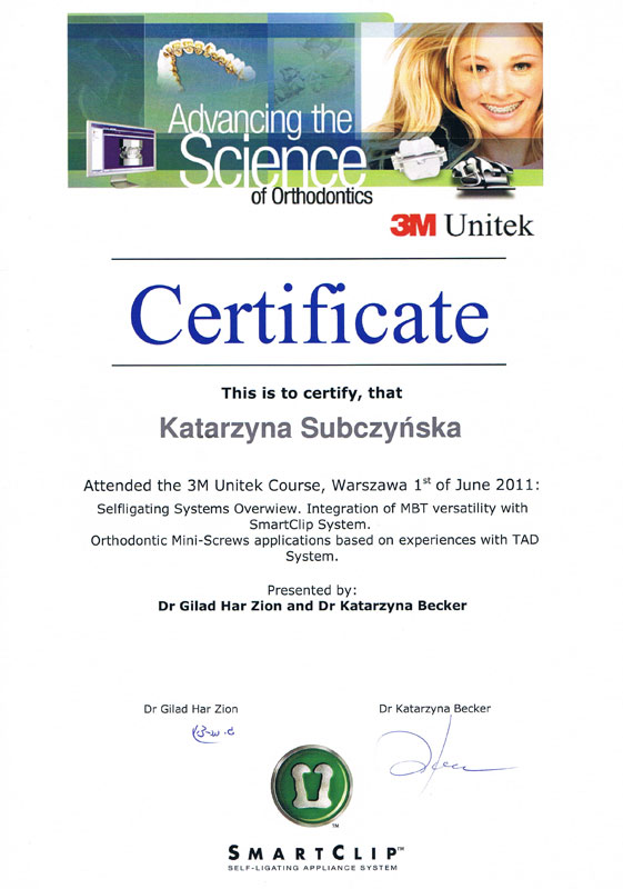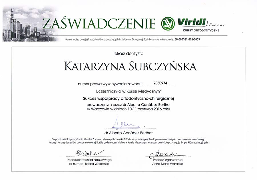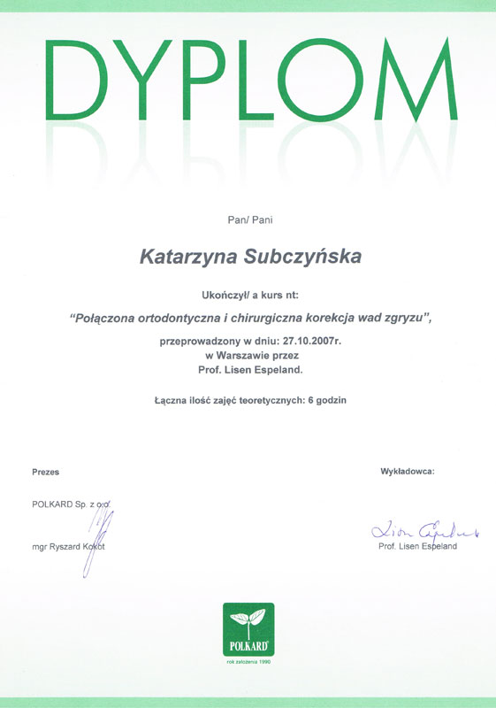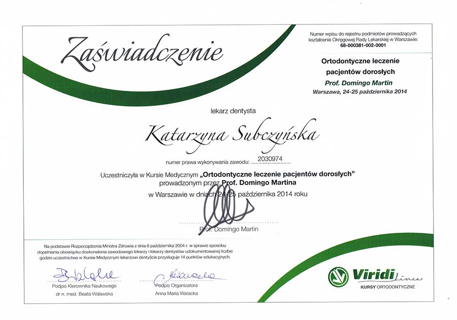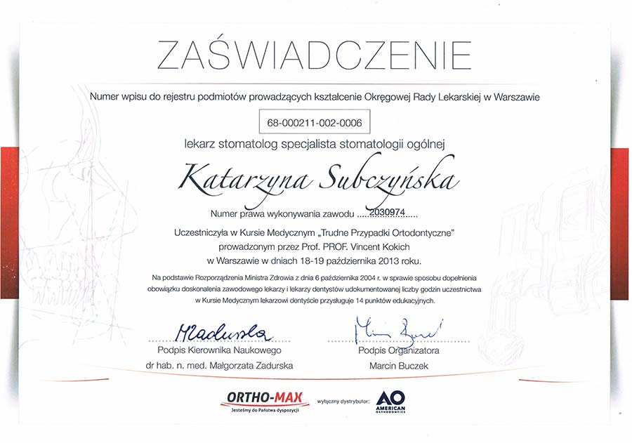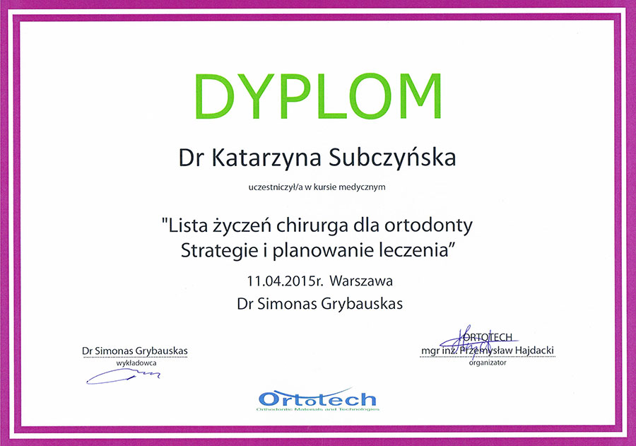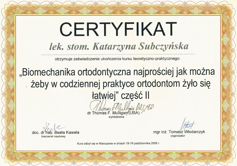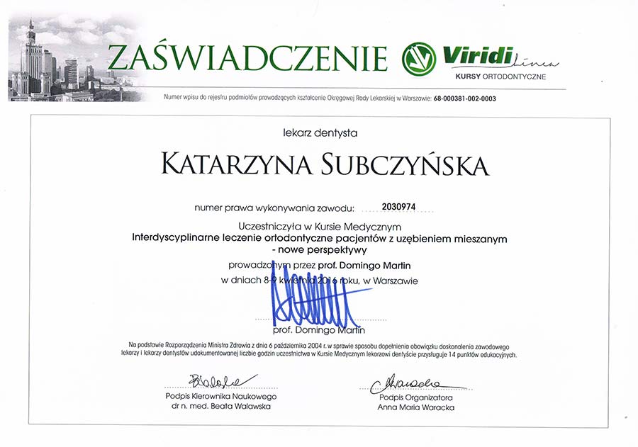 W naszej klinice zajmuje się leczeniem ortodontycznym dzieci i dorosłych, w szczególności nowoczesnym leczeniem projektowanymi cyfrowo nakładkami ortodontycznymi. Stosuje także aparaty ruchome i stałe — zarówno metalowe, jak i estetyczne. Dyplom Uniwersytetu Medycznego w Łodzi uzyskała w 2004 roku. W codziennej praktyce korzysta z innowacyjnych metod leczenia, w tym mikroimplantów i aparatów samoligaturujących, aby osiągać jak najlepsze efekty terapii. Regularnie uczestniczy w szkoleniach i kongresach w Polsce oraz za granicą, stale rozwijając swoje kompetencje. Ukończyła elitarny program FACE — 2-letni podyplomowy cykl szkoleń teoretycznych i praktycznych z zakresu zaawansowanej ortodoncji.