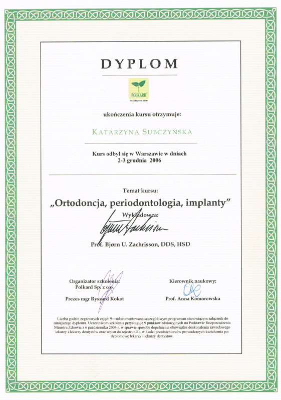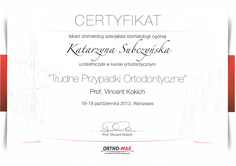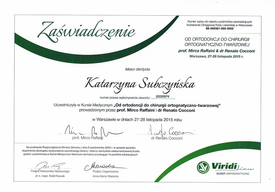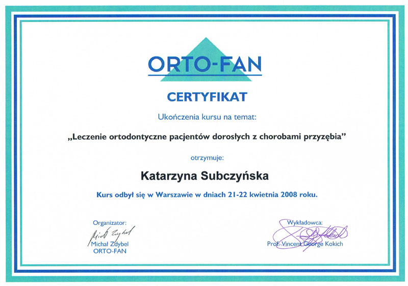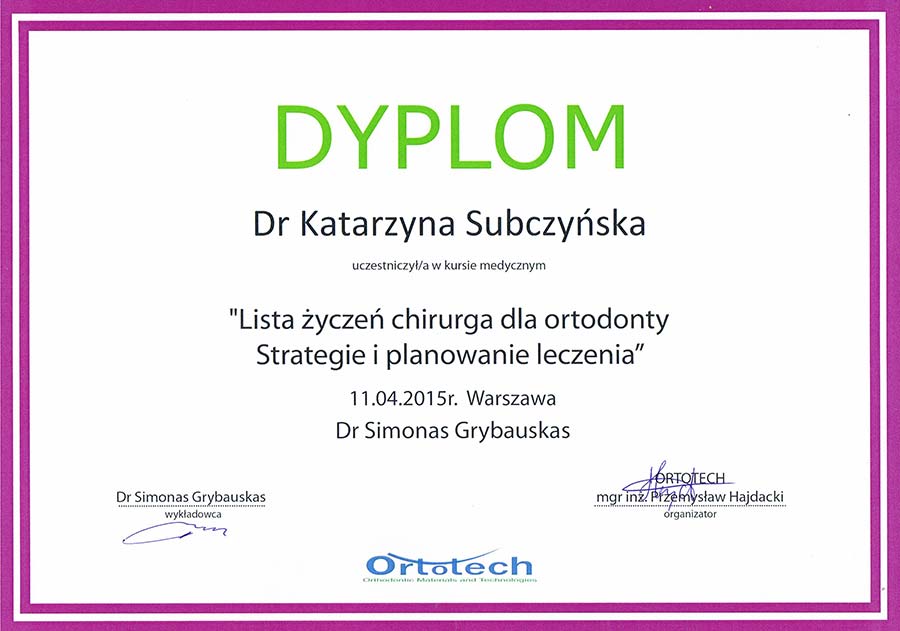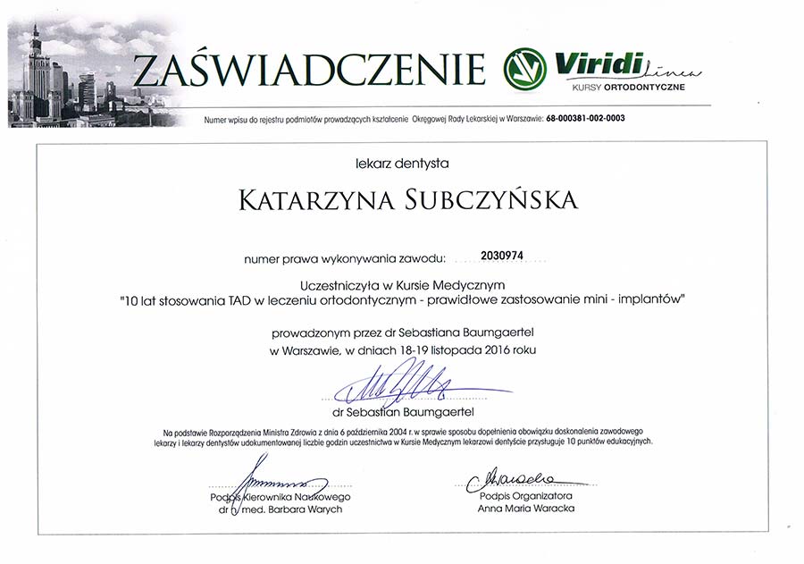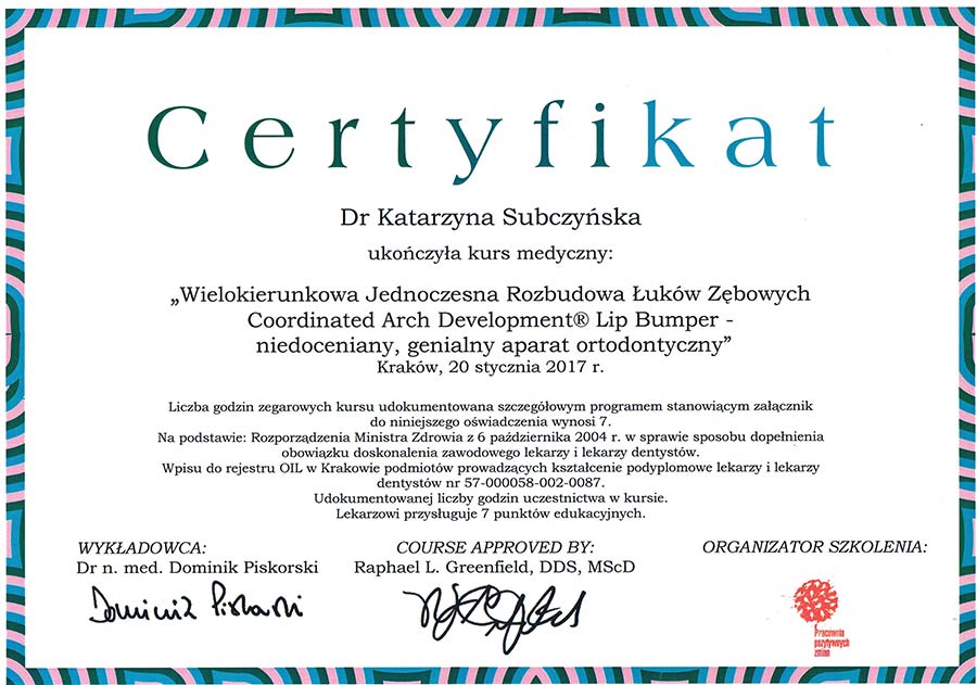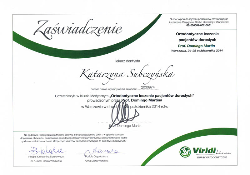W naszej klinice zajmuje się leczeniem ortodontycznym dzieci i dorosłych, w szczególności nowoczesnym leczeniem projektowanymi cyfrowo nakładkami ortodontycznymi. Stosuje także aparaty ruchome i stałe — zarówno metalowe, jak i estetyczne. Dyplom Uniwersytetu Medycznego w Łodzi uzyskała w 2004 roku. W codziennej praktyce korzysta z innowacyjnych metod leczenia, w tym mikroimplantów i aparatów samoligaturujących, aby osiągać jak najlepsze efekty terapii. Regularnie uczestniczy w szkoleniach i kongresach w Polsce oraz za granicą, stale rozwijając swoje kompetencje. Ukończyła elitarny program FACE — 2-letni podyplomowy cykl szkoleń teoretycznych i praktycznych z zakresu zaawansowanej ortodoncji.